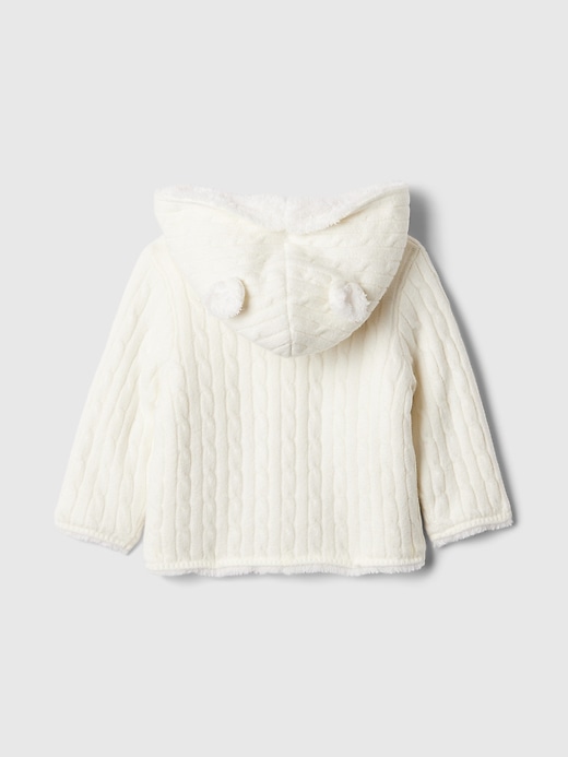 • Supersoft cable-knit sweater cardigan with cozy sherpa lining.