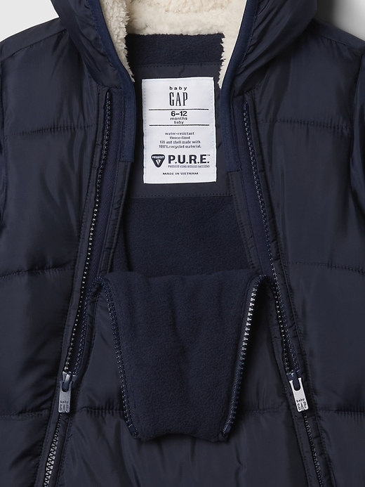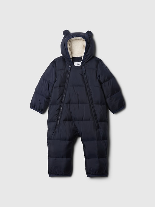 - This snowsuit’s outer is made with 100% recycled polyester. Compared to virgin materials, using recycled materials helps to reduce resource use and waste.