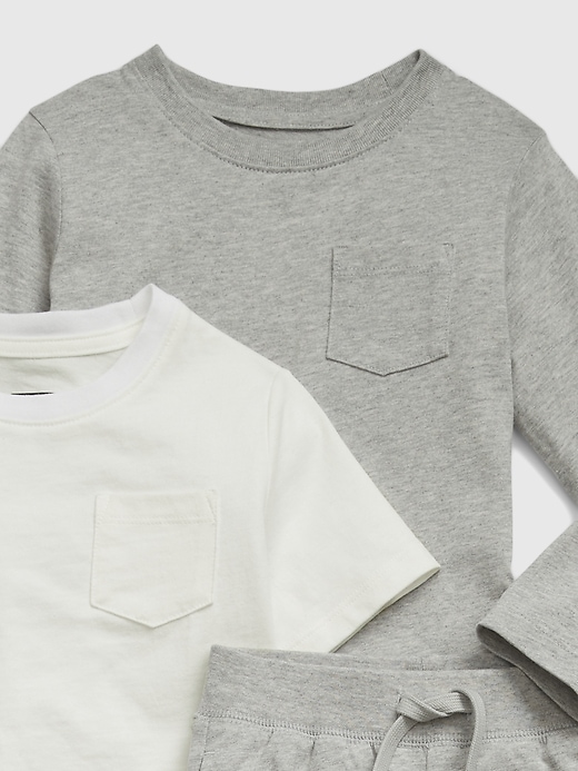 - Second t-shirt features crewneck, short sleeves, and patch pocket at chest.