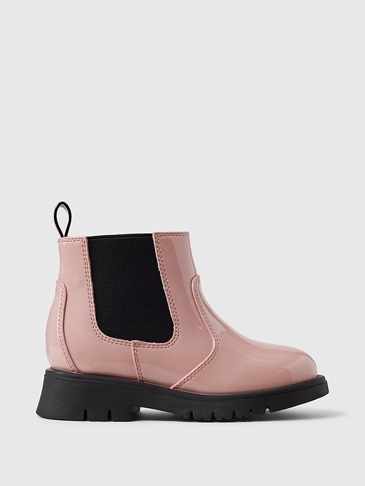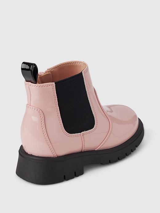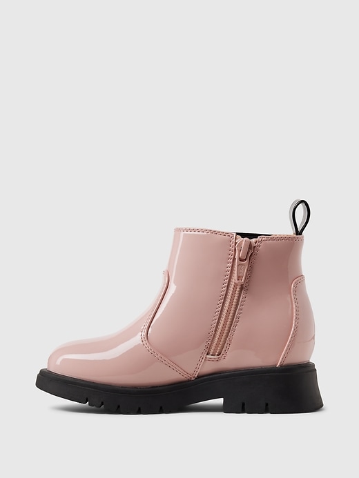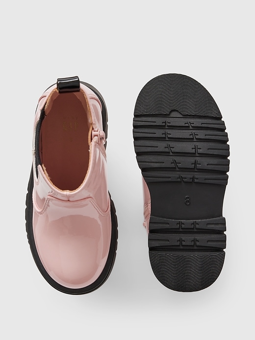 - These boots are made with a vegan patent leather upper.
