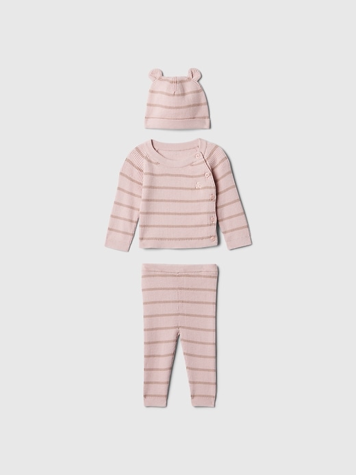 - Soft cotton ribbed wrap top, pants, and beanie set.