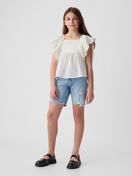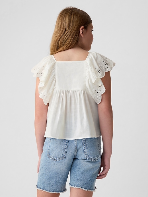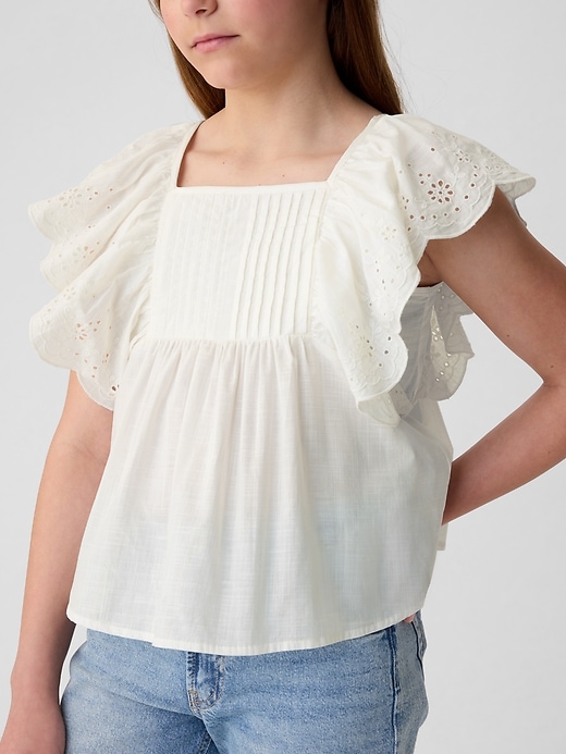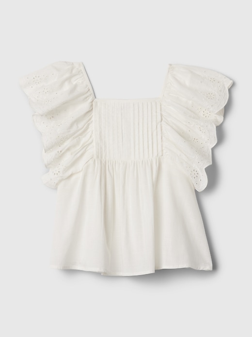 - Short flutter sleeves with eyelet lace detailing and scalloped hem.