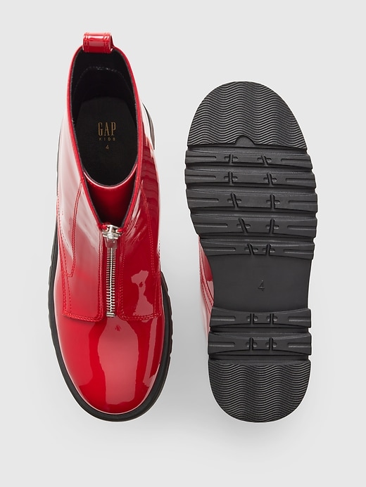 - These ankle boots are made with a vegan patent leather upper.