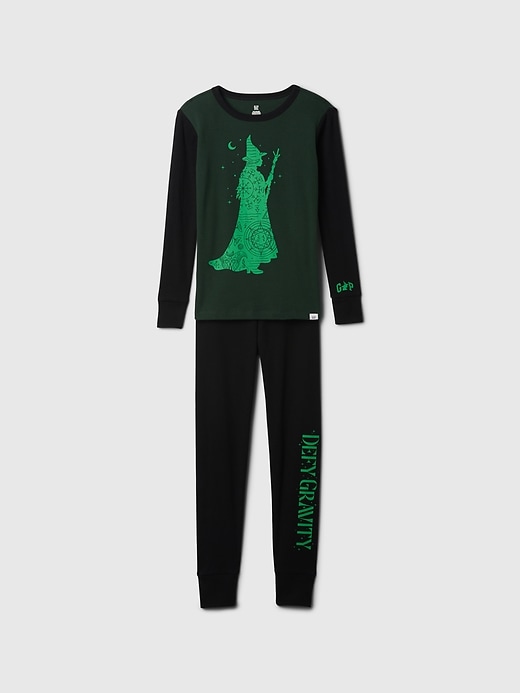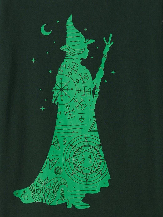 - Wicked witch graphic at front, Gap logo at sleeve, and Wicked slogan at pant leg.