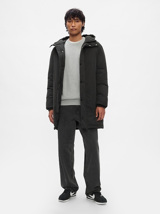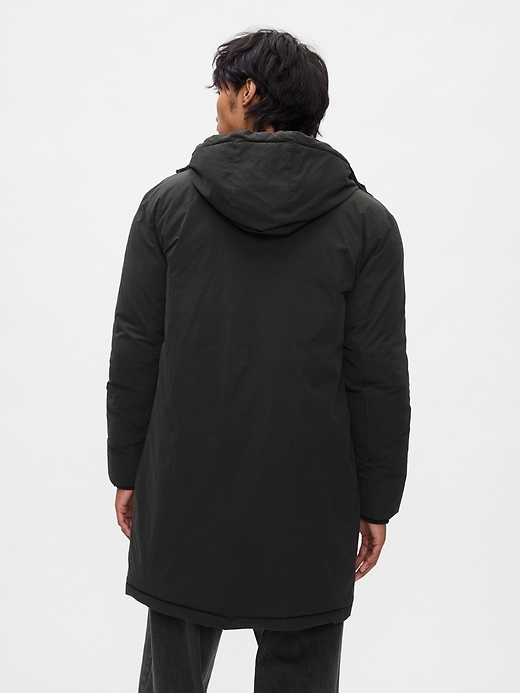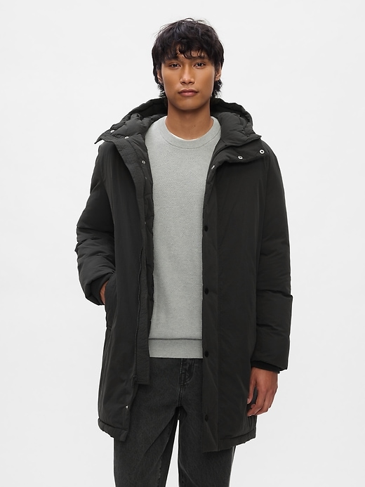 • Smooth, water-resistant recycled nylon parka jacket.