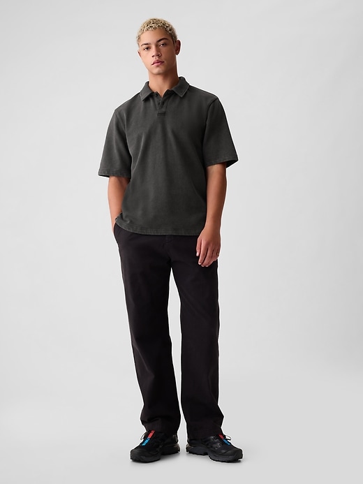 - Soft cotton-blend fleece polo-style sweatshirt.