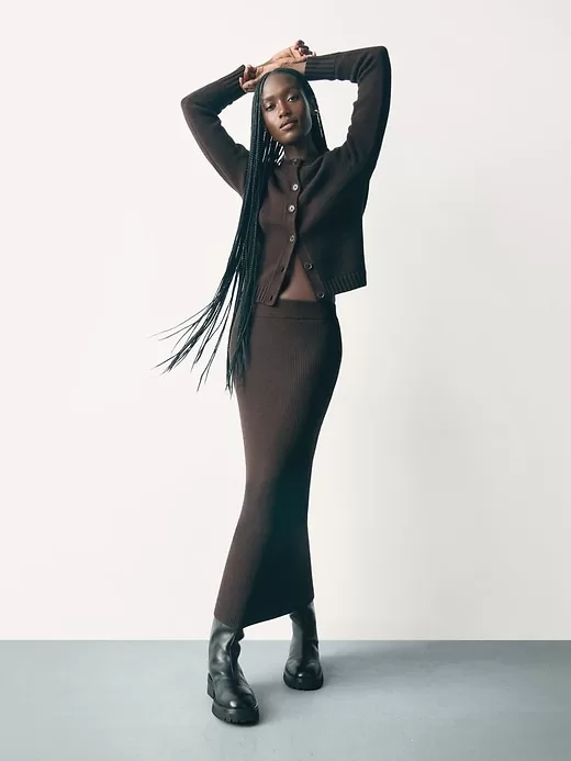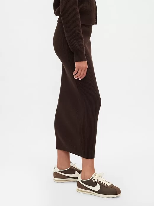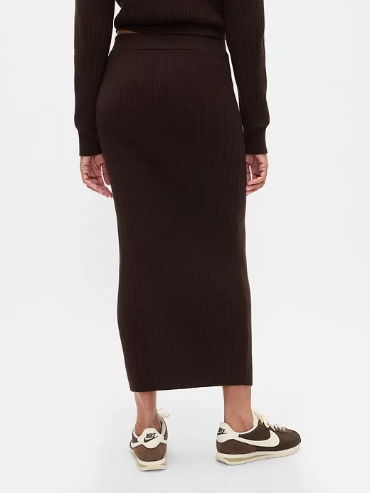- Supersoft cotton-blend ribbed knit pull-on maxi sweater skirt.