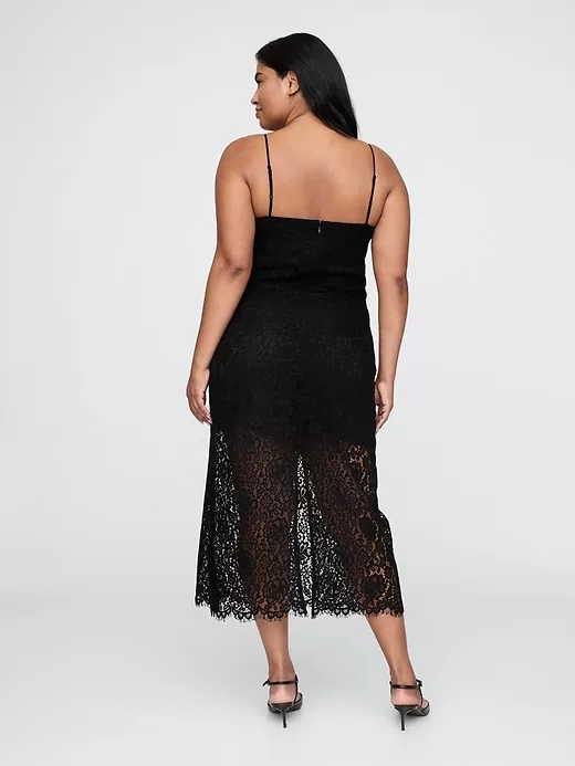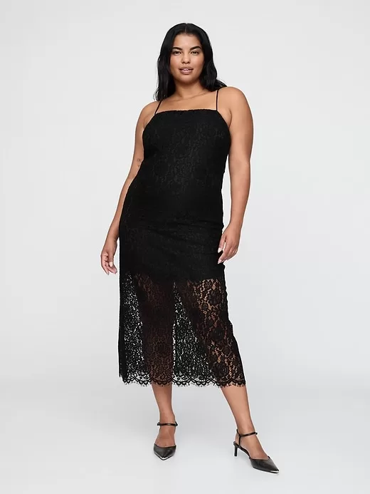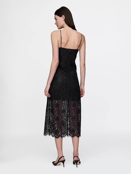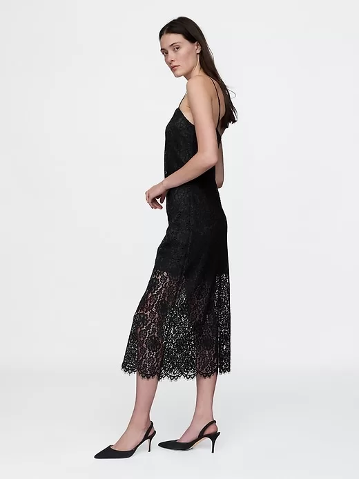 - Soft lace and smooth satin-lined midi dress.