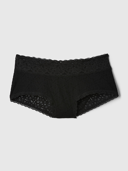 - Elasticized lace with scalloped detail trim at waistband at leg openings.