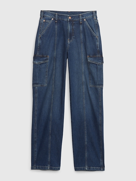 - Details: Zip fly, five-pocket styling, cargo pockets at sides, and seams at front.