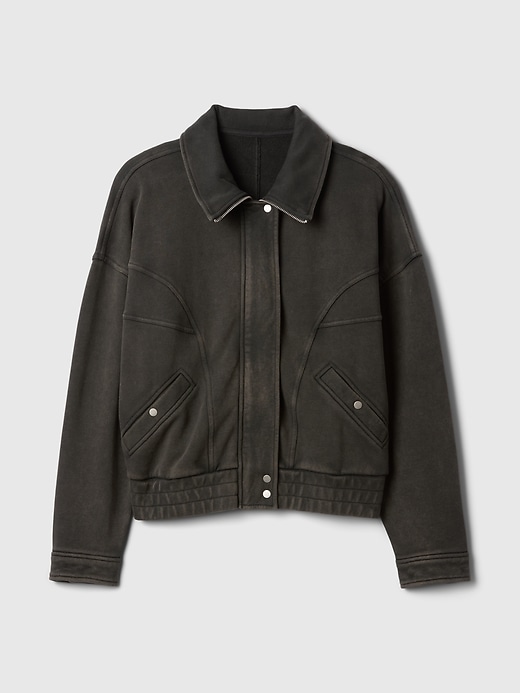 - Soft cotton-blend fleece sweatshirt denim bomber jacket.